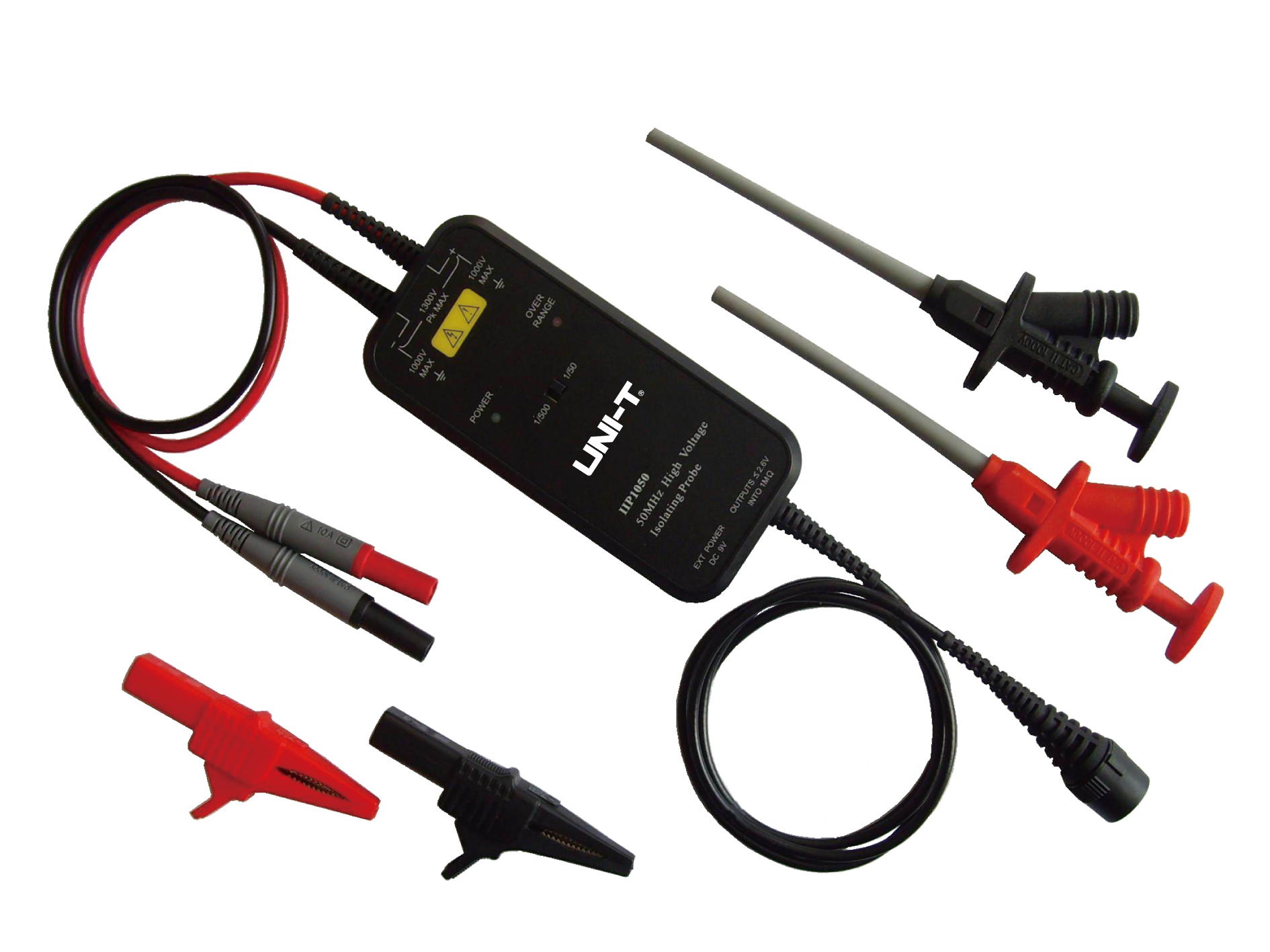 UT-P36 Дифференциальный пробник высокого напряжения: 1/200:560 (постоянный ток + пиковый переменный ток) 1/2000:5600 (постоянный ток + пиковый переменный ток), полоса пропускания: 100 МГц, точность: 2 %
