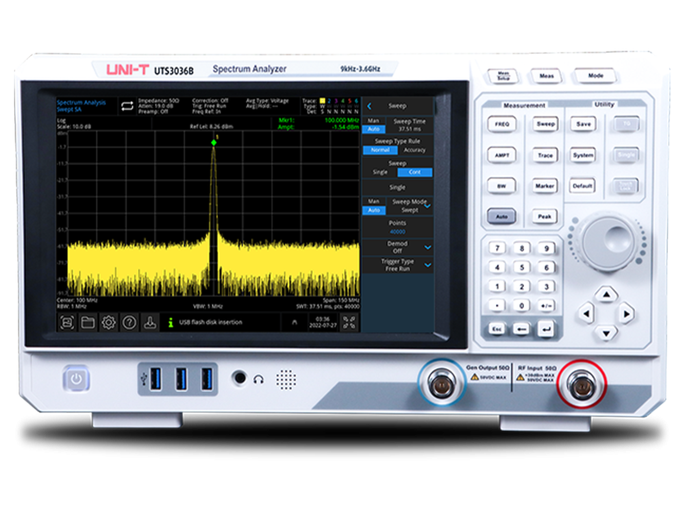 Серия UTS3000B Анализатор спектра серии UTS3000B может измерять частоты до 8,4 ГГц. Это анализатор спектра с широким диапазоном частот и превосходной производительностью. В этой серии используется проверенная временем полностью цифровая технология промежуточной частоты. Он предоставляет различные функции анализа и поддерживает до 40 001 точки сканирования, что упрощает анализ частотной области. В этой серии спектрометров используется большой сенсорный экран с диагональю 10,1 дюйма, который повышает удобство использования. Серия UTS3000B может использоваться для функциональных/терминальных/качественных проверок в электронной промышленности, а также для измерений в области беспроводной связи, радиочастотных и микроволновых технологий, предварительного сканирования на предмет электромагнитной совместимости, измерения полупроводников и во многих других сферах.