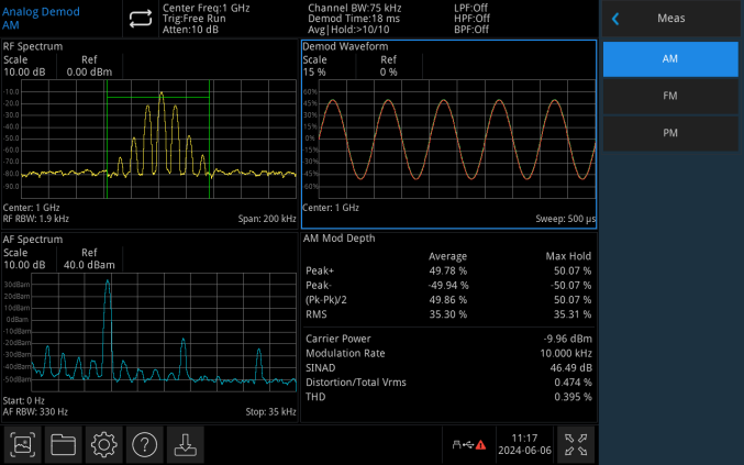 Анализ аналоговой Демодуляции Обеспечивает демодуляционный анализ аналоговых сигналов AM, FM, PM