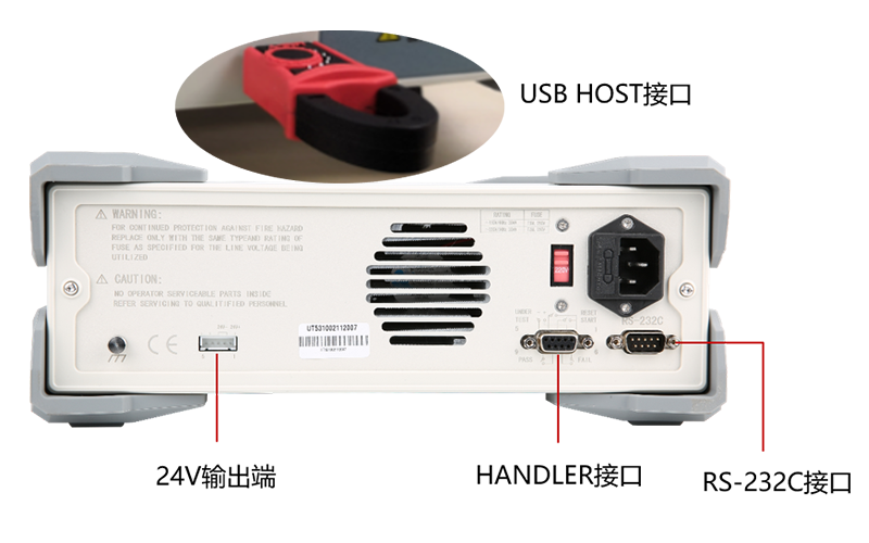 Мощный интерфейс * Интерфейс RS-232C: интерфейс последовательной связи, который реализует коммуникационное соединение с компьютером. • Выходная клемма 24 В: внутри прибора предусмотрен выход 24 В, который можно использовать с интерфейсом HANDLER. * Интерфейс ОБРАБОТЧИКА: вы можете вводить сигналы ЗАПУСКА и остановки, а также выводить сигналы ТЕСТИРОВАНИЯ, прохождения и СБОЯ.Удобно соединяться с ножным переключателем для формирования ножного управления и подключаться к простому испытательному приспособлению для обеспечения безопасной блокировки, пневматического управления, инструкций по тестированию и т.д. * Интерфейс USB HOST: используется для подключения флэш-накопителя USB (U-диска), поддержки файловых систем FAT16 и FAT32; поддержки обновления встроенного ПО, записи тестовых данных, сохранения изображений экрана, сохранения и вызова файлов тестовых параметров и т.д.