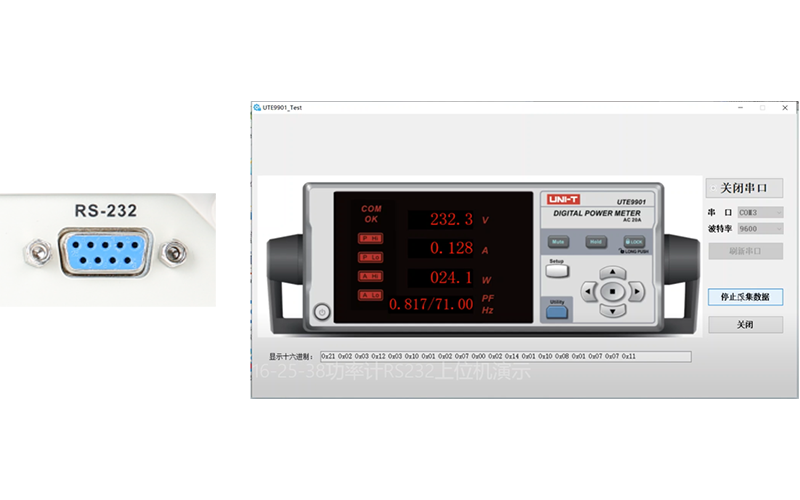 Коммуникационный интерфейс RS-232 UTE9901 поставляется в стандартной комплектации с интерфейсом RS-232, который может быть подключен к COM-порту компьютера с помощью соответствующей линии связи RS-232 по мере необходимости для удаленного управления с целью автоматизации тестирования.