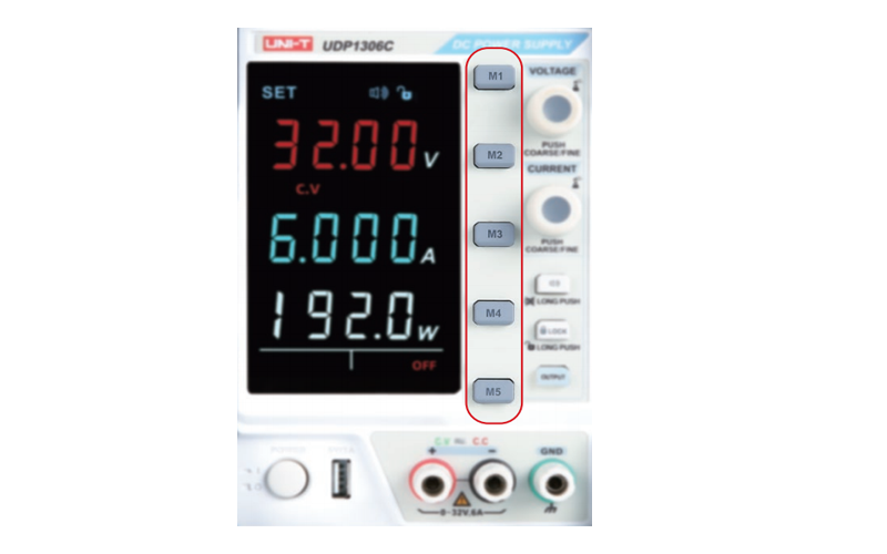 Пять наборов настроек для сохранения и вызова M1~M5 — пять групп сохранённых значений. Для сохранения нажмите и удерживайте, для вызова — нажмите и отпустите. Удобно для тестирования.