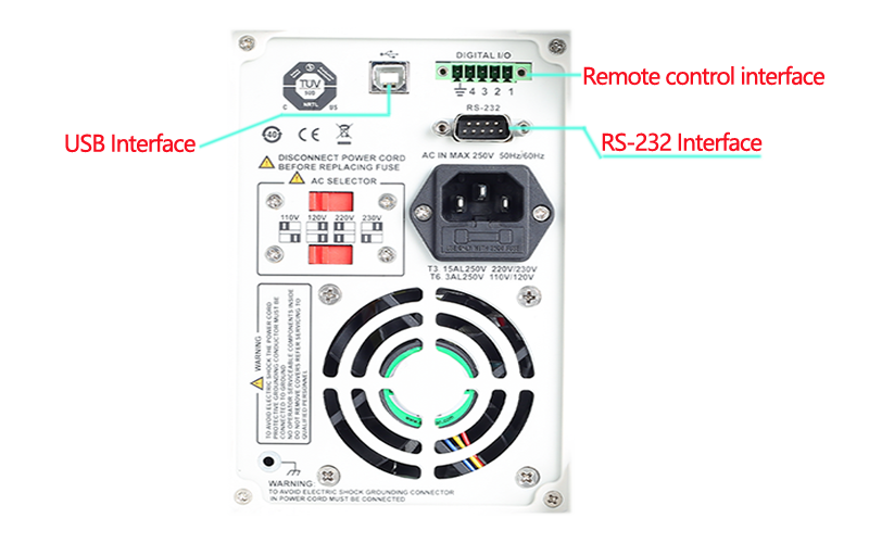 Функция интерфейса Интерфейс цифрового ввода-вывода с дистанционным управлением; позволяет осуществлять дистанционное управление выходом и отключением канала питания. Интерфейс RS-232, порт USB-устройства, на основе команды связи SCPI, могут взаимодействовать с компьютером.