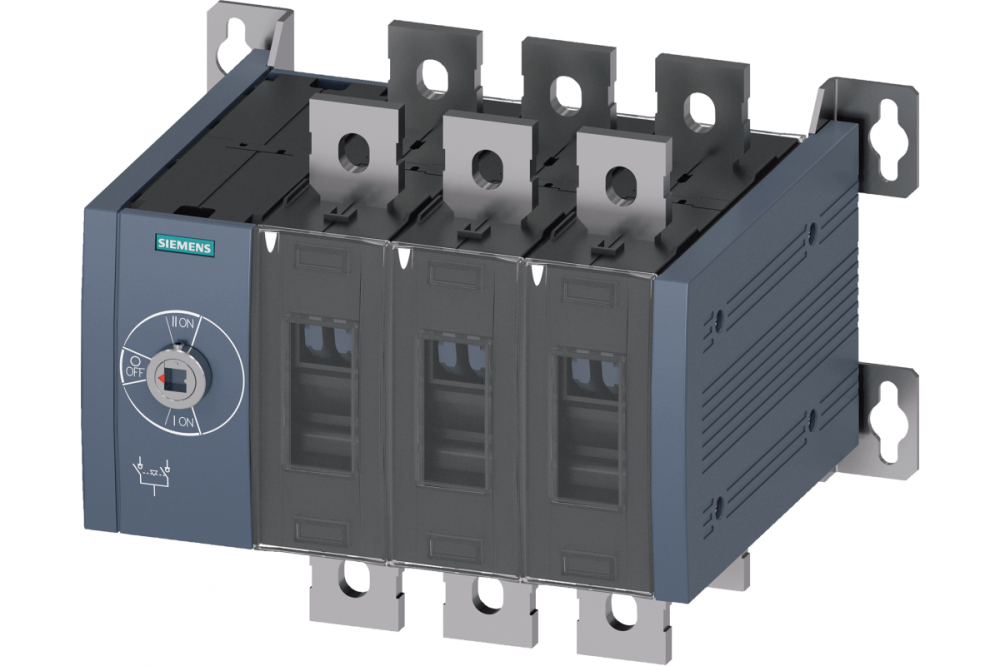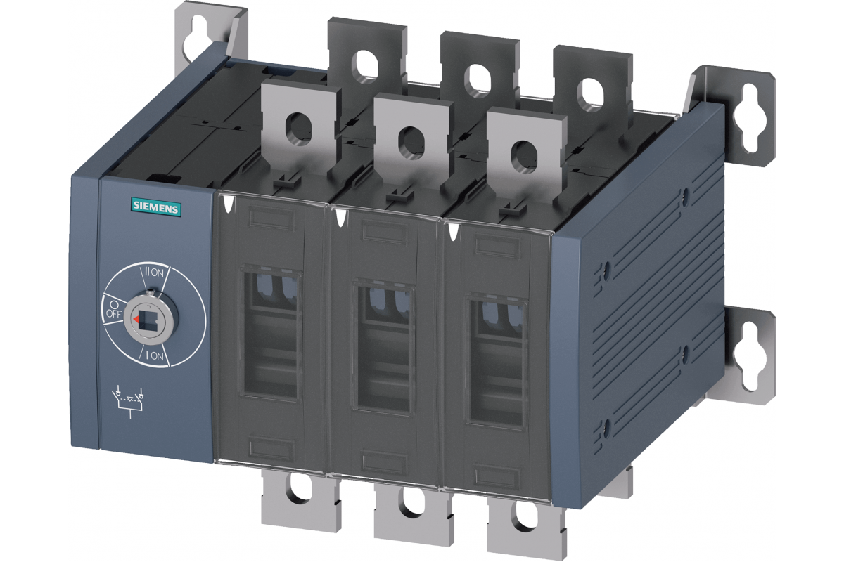 SENTRON, 3KC передаточное коммутационное оборудование, с ручным управлением, MTSE, типоразмер: 4, 3-полюсный, Iu: 500 A, Ue AC: 415 В, Ie при AC-33 B при 415 В: 500 A, Ie при AC-23 A при 690 В: 500 A, Винтовое крепление, передний механизм управления, на левом конце, без ручки, подключение к шине