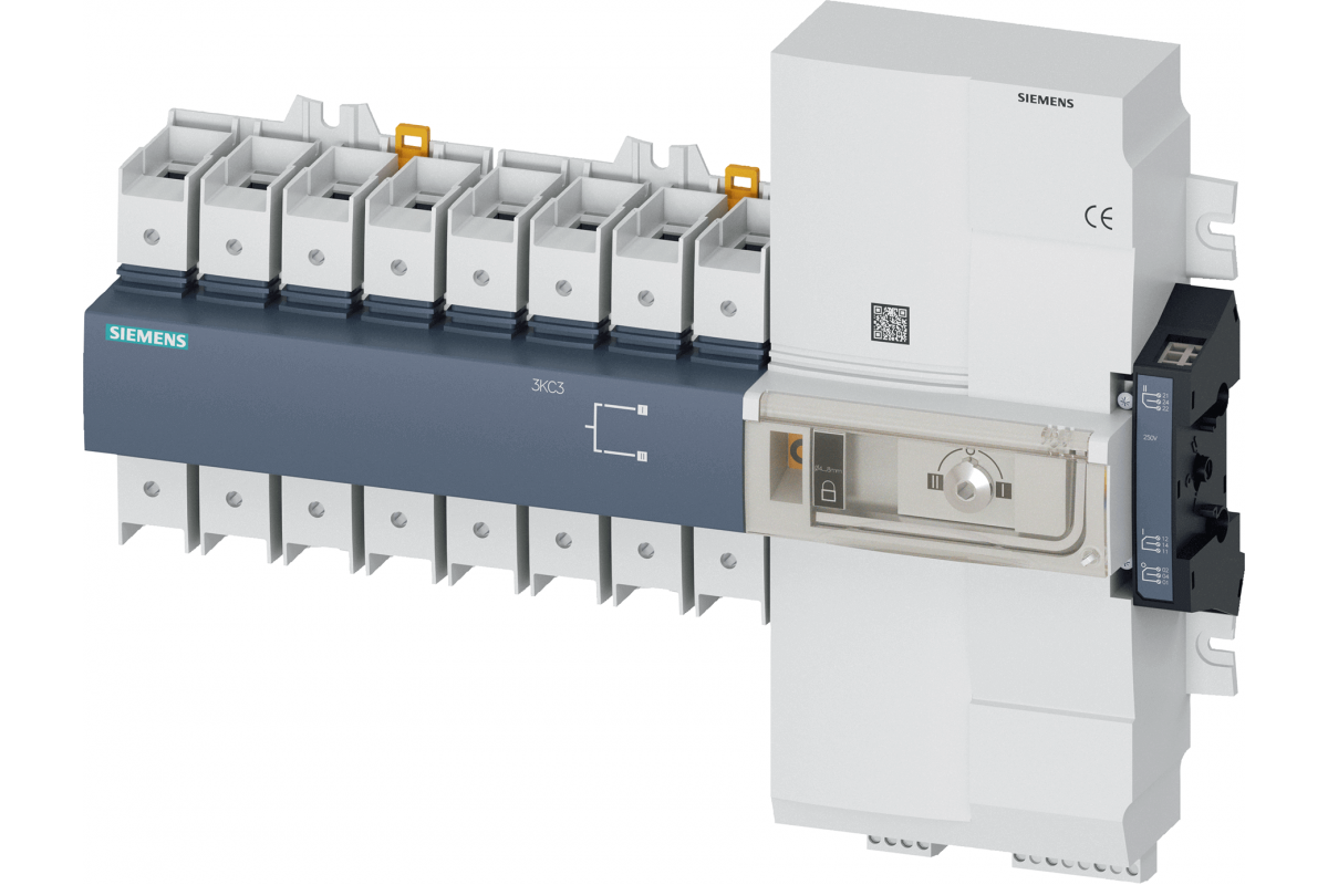 SENTRON, передаточное коммутационное оборудование 3KC, с дистанционным управлением, RTSE, 4-полюсный, Iu: 63 A, Ue AC: 415 В, Ie при AC-33 B при 415 В: 63 A, Ie при AC-23 A при 690 В: 63 A, винт и стандартная монтажная шина на 35 мм, моторизованный рабочий механизм, на правом конце, длинная ручка, клемма в коробке