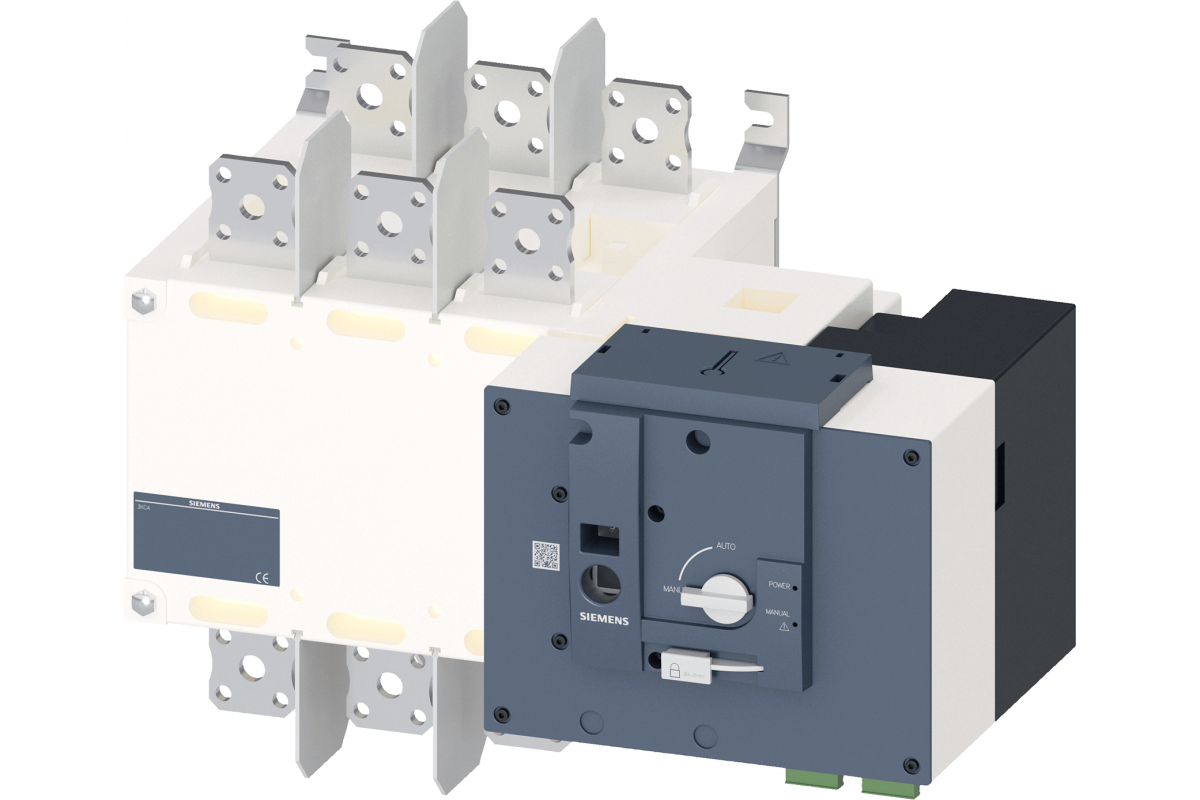 SENTRON, передаточное коммутационное оборудование 3KC, с дистанционным управлением, RTSE, 3-полюсный, Iu: 800 A, Ue AC: 415 В, Ie при AC-33 B при 415 В: 800 A, Ie при AC-23 A при 690 В: 630 A, винтовое крепление, моторизованный рабочий механизм, на правом конце, длинная рукоятка, шинное соединение