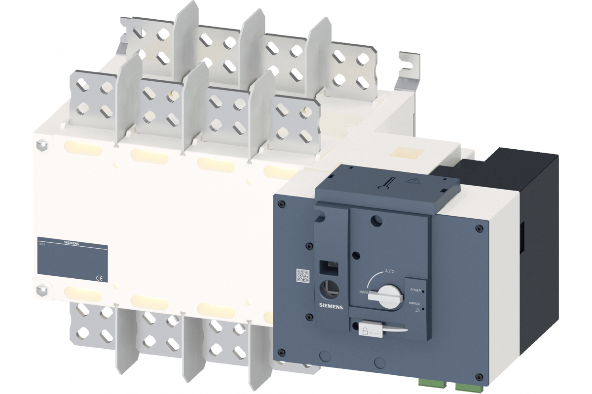 SENTRON, передаточное коммутационное оборудование 3KC, с дистанционным управлением, RTSE, 4-полюсный, Iu: 1250 A, Ue AC: 415 В, Ie при AC-33 B при 415 В: 1000 A, Ie при AC-23 A при 690 В: 800 A, винтовое крепление, моторизованный механизм управления, на правом конце, длинная рукоятка, шинное соединение