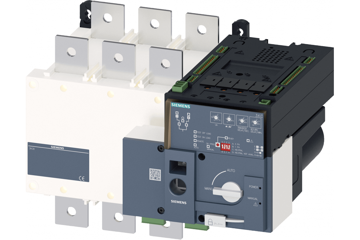 SENTRON, ATE, передаточное коммутационное оборудование 3KC, автоматически, ATSE, 3-полюсный, Iu: 630 A, Ue AC: 415 В, Ie при AC-33 B при 415 В: 400 A, Ie при AC-23 A при 690 В: 400 A, винтовое крепление, моторизованный рабочий механизм, на правом конце, длинная рукоятка, подключение к шине