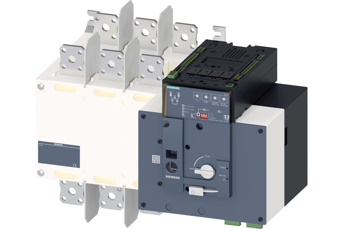 SENTRON, ATE, передаточное коммутационное оборудование 3KC, автоматически, ATSE, 3-полюсный, Iu: 800 A, Ue AC: 415 В, Ie при AC-33 B при 415 В: 800 A, Ie при AC-23 A при 690 В: 630 A, винтовое крепление, моторизованный механизм управления, на правом конце, длинная рукоятка, шинное соединение