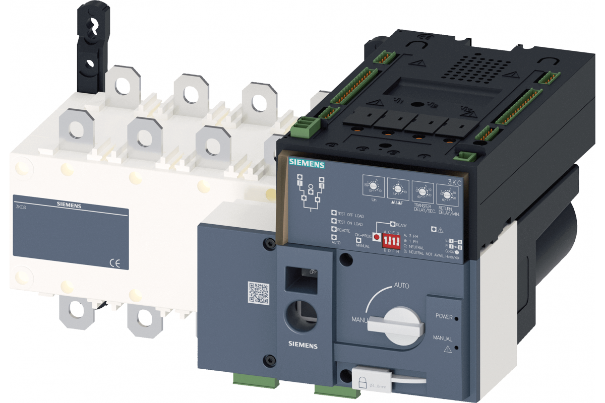 SENTRON, ATE, переключающее оборудование 3KC, автоматически, ATSE, 4-полюсное, Iu: 250 A, Ue AC: 415 В, Ie при AC-33 B при 415 В: 200 A, Ie при AC-23 A при 690 В: 125 A, винтовое крепление, моторизованный механизм управления, на правом конце, длинная рукоятка, шинное соединение
