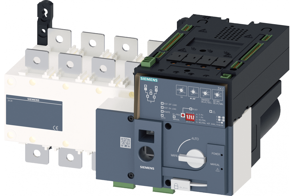 SENTRON, ATE, передаточное коммутационное оборудование 3KC, автоматически, ATSE, 4-полюсный, Iu: 400 A, Ue AC: 415 В, Ie при AC-33 B при 415 В: 200 A, Ie при AC-23 A при 690 В: 125 A, винтовое крепление, моторизованный механизм управления, на правом конце, длинная рукоятка, шинное соединение