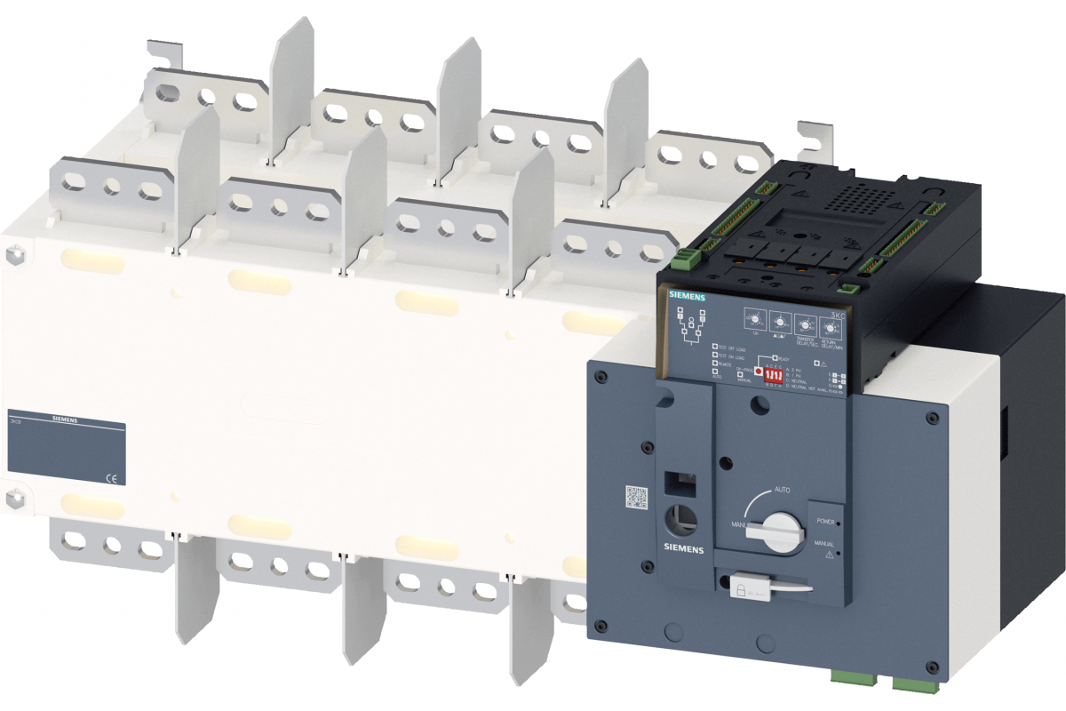 SENTRON, ATE, передаточное коммутационное оборудование 3KC, автоматически, ATSE, 4-полюсный, Iu: 1600 A, Ue AC: 415 В, Ie при AC-33 B при 415 В: 1000 A, Ie при AC-23 A при 690 В: 800 A, винтовое крепление, моторизованный механизм управления, на правом конце, длинная рукоятка, шинное соединение
