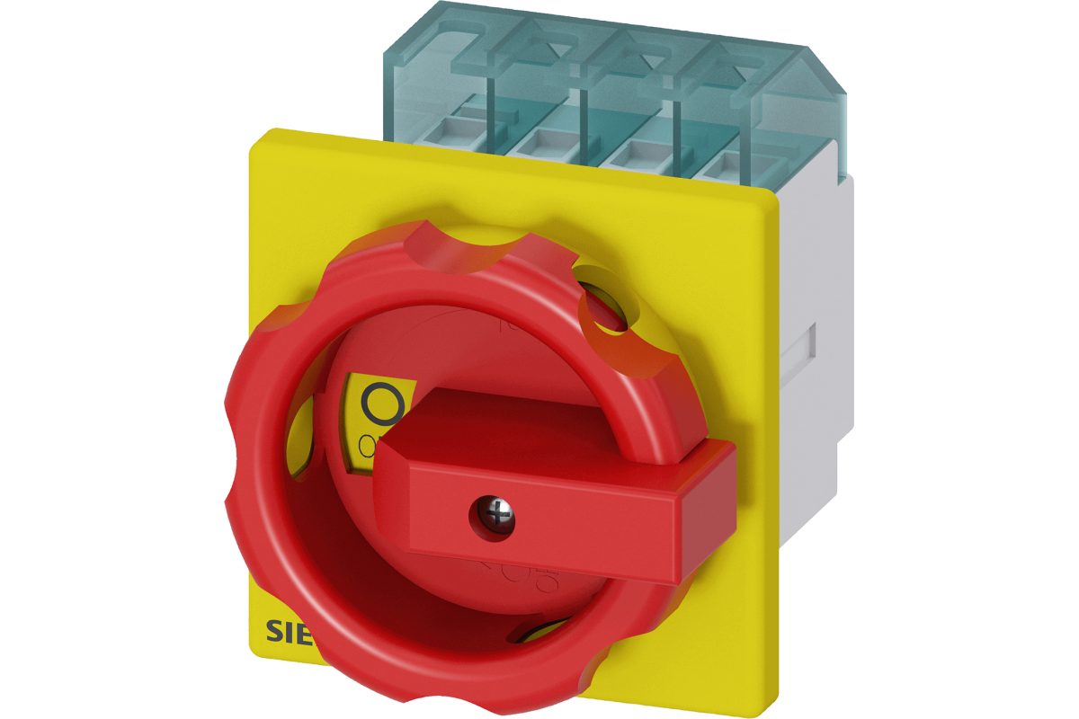 SENTRON, Выключатель-разъединитель 3LD, аварийный выключатель, 3-полюсный, Iu: 16 A, рабочая мощность / при AC-23 A 400 В: 7.5 кВт, фронтальный монтаж, поворотный механизм управления, красный / желтый, монтаж рукоятки на 4 отверстия