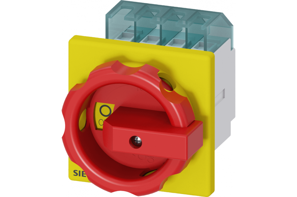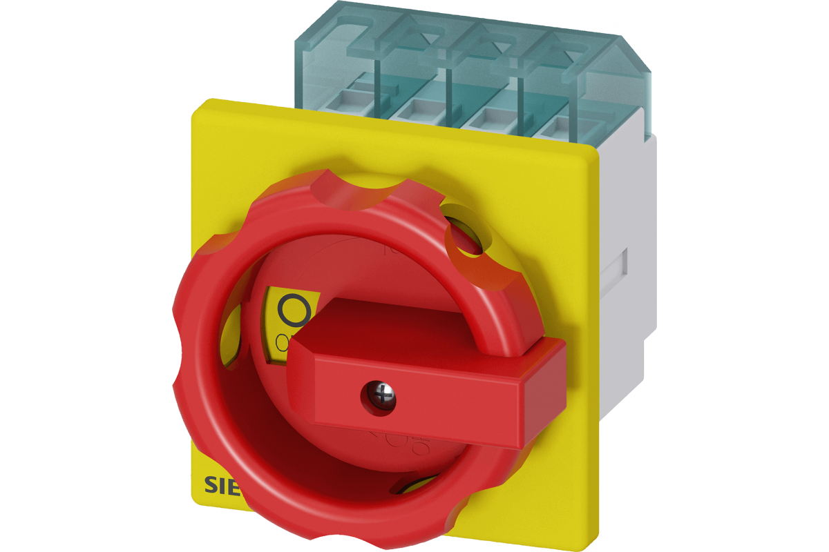 SENTRON, Выключатель-разъединитель 3LD, аварийный выключатель, 4-полюсный, Iu: 16 A, рабочая мощность / при AC-23 A 400 В: 7.5 кВт, фронтальный монтаж, поворотный рабочий механизм, красный / желтый, крепление рукоятки на 4 отверстия