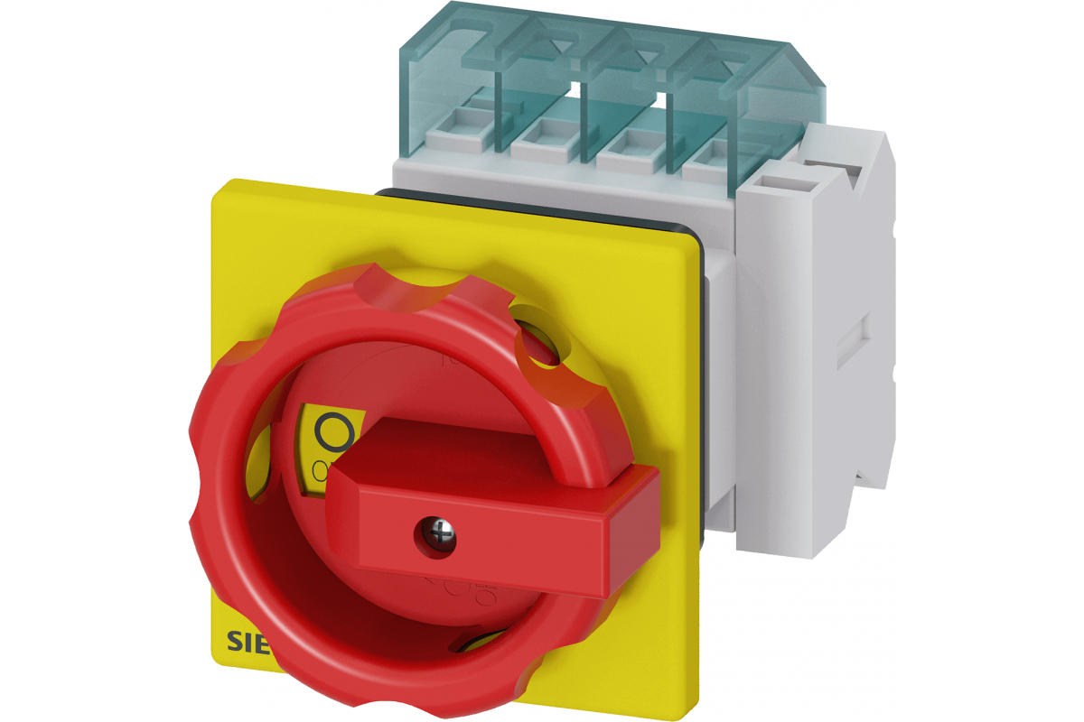 SENTRON, Выключатель-разъединитель 3LD, аварийный выключатель, 4-полюсный, Iu: 16 A, рабочая мощность / при AC-23 A 400 В: 7.5 кВт, фронтальный монтаж, 1 NC, 1 NO, поворотный рабочий механизм, красный / желтый, центральный монтаж 22.5 мм рукоятка