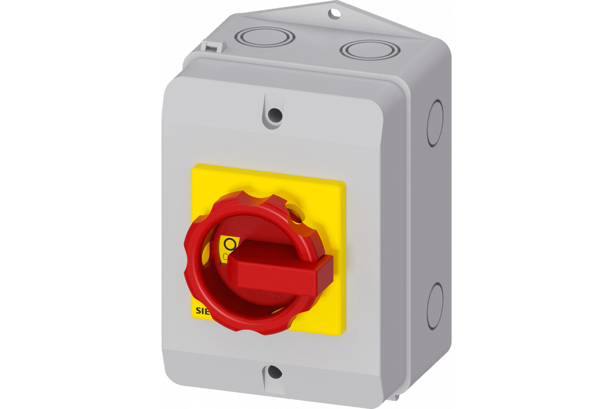 3-P. главный/аварийный выключатель iu=16, p/ac-23a at 400v=7.5kw 1 n-клемма + 1 pe-клемма пластиковый корпус , ip65 поворотная рукоятка красная/желтая