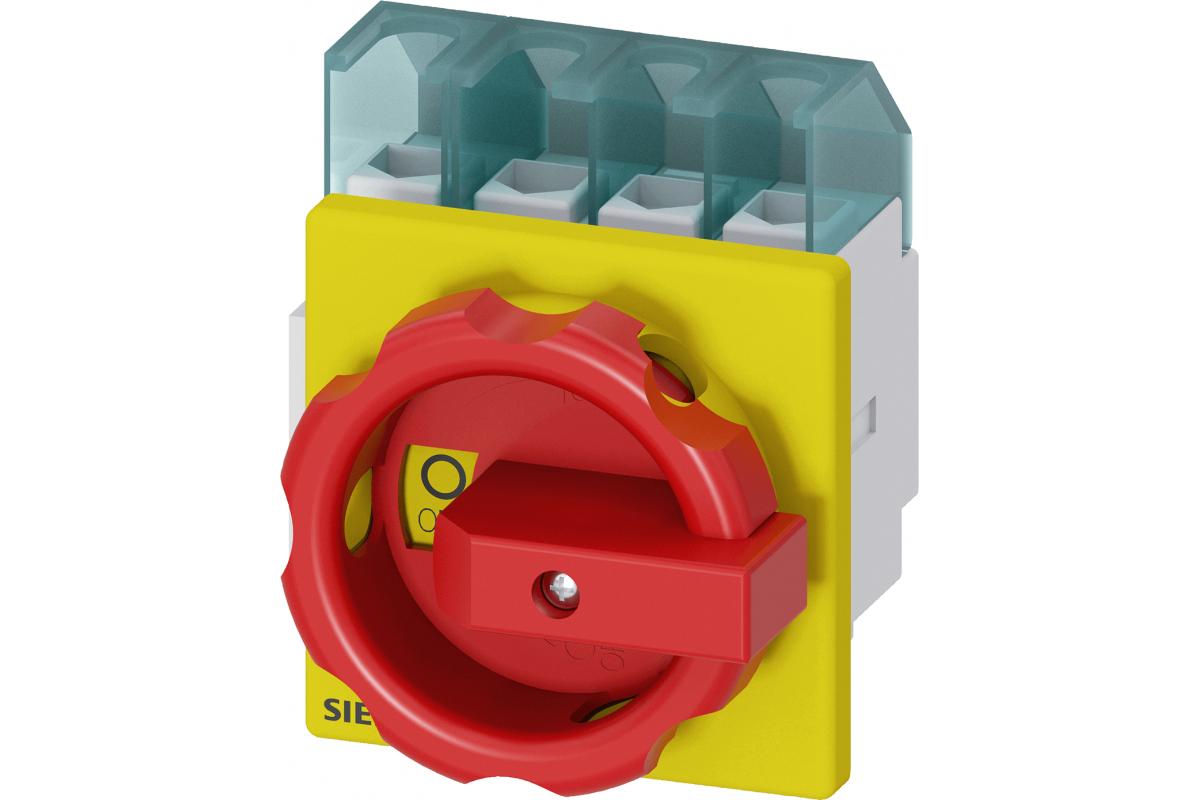 SENTRON, Разъединитель 3LD, аварийный выключатель, 4-полюсный, Iu: 25 A, рабочая мощность / при AC-23 A 400 В: 9.5 кВт, фронтальный монтаж, поворотный рабочий механизм, красный / желтый, крепление рукоятки на 4 отверстия