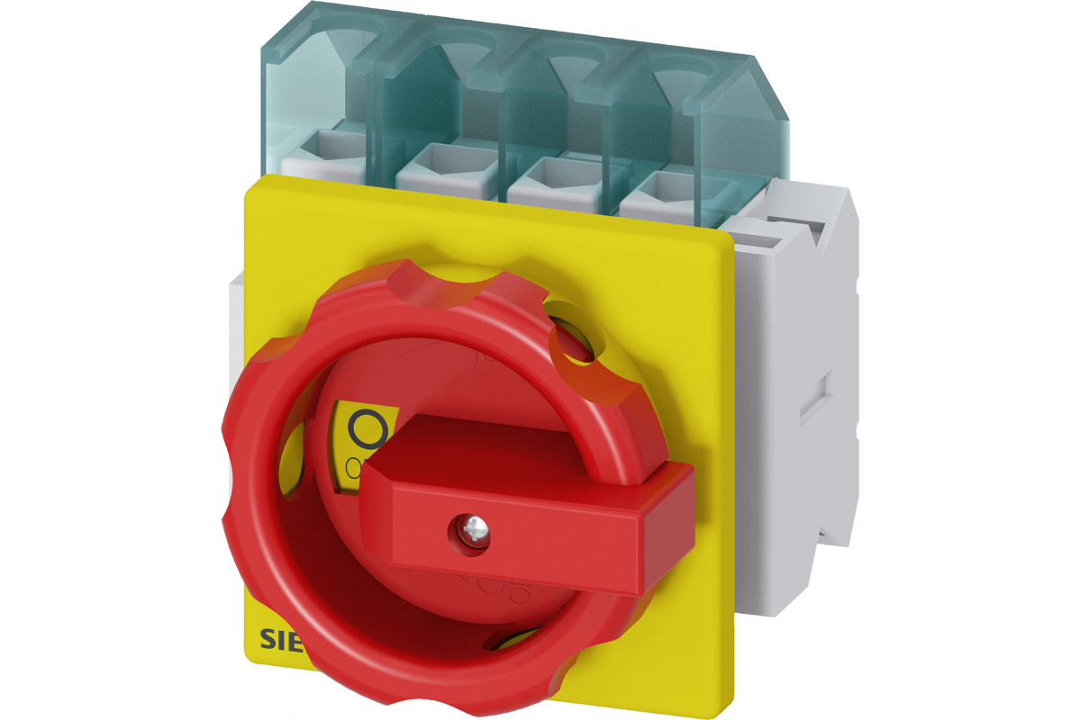 SENTRON, Разъединитель 3LD, аварийный выключатель, 4-полюсный, Iu: 25 A, рабочая мощность / при AC-23 A 400 В: 9.5 кВт, фронтальный монтаж, 1 NC, 1 NO, поворотный механизм управления, красный / желтый, крепление рукоятки в 4 отверстия