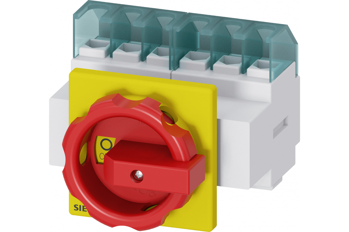 SENTRON, Выключатель-разъединитель 3LD, аварийный выключатель, 6-полюсный, Iu: 25 A, рабочая мощность / при AC-23 A 400 В: 9.5 кВт, фронтальный монтаж, поворотный механизм управления, красный / желтый, монтаж рукоятки на 4 отверстия