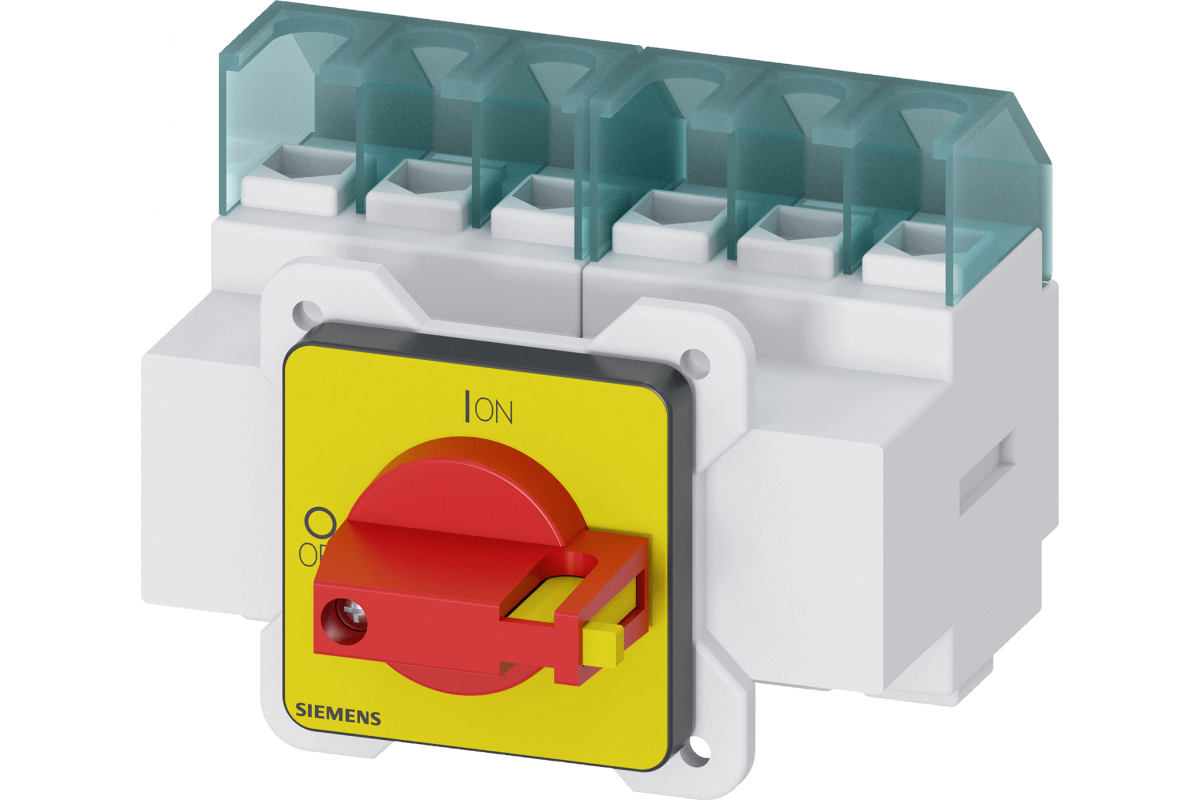 SENTRON, Выключатель-разъединитель 3LD, аварийный выключатель, 6-полюсный, Iu: 25 A, рабочая мощность / при AC-23 A при 400 В: 9.5 кВт, напольный монтаж с дверной муфтой, механизм с ручкой, красный/желтый, монтаж ручки на 4 отверстия, в нейтральном положении может быть заблокирован