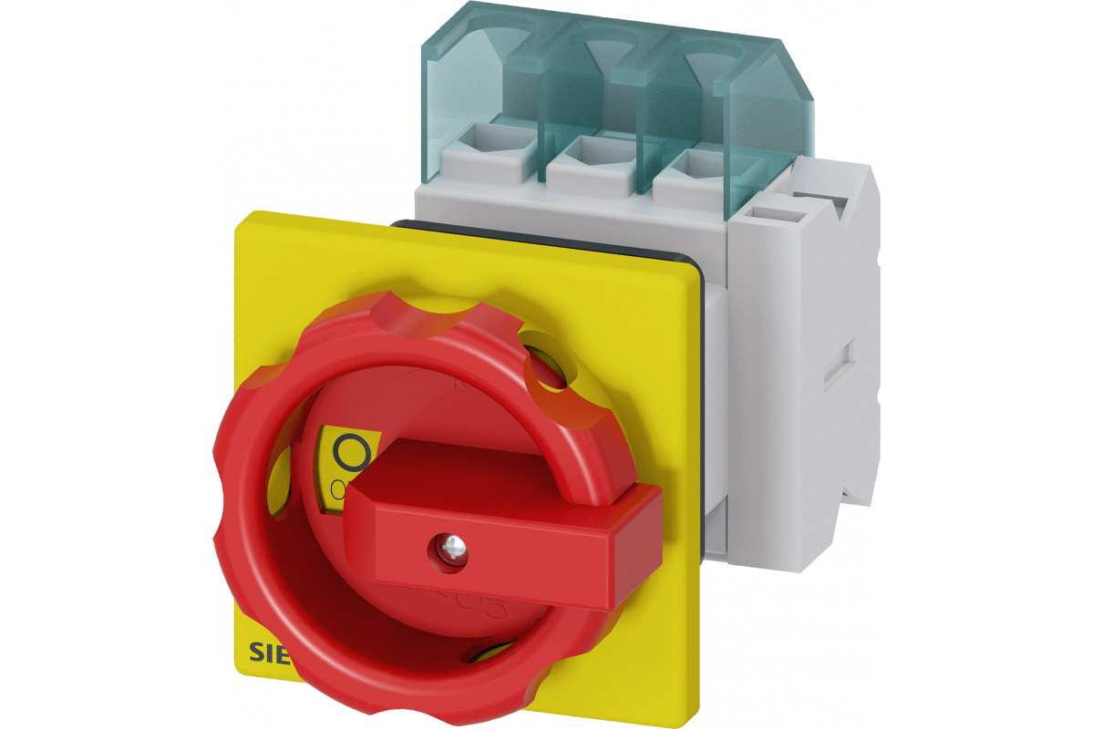 SENTRON, Выключатель-разъединитель 3LD, аварийный выключатель, 3-полюсный, Iu: 25 A, Рабочая мощность / при AC-23 A 400 В: 9.5 кВт, фронтальный монтаж, 1 NC, 1 NO, поворотный рабочий механизм, красный / желтый, центральный монтаж 22.5 мм рукоятка