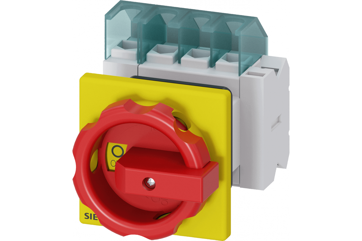 SENTRON, Разъединитель 3LD, аварийный выключатель, 4-полюсный, Iu: 25 A, рабочая мощность / при AC-23 A 400 В: 9.5 кВт, фронтальный монтаж, 1 NC, 1 NO, поворотный рабочий механизм, красный / желтый, центральный монтаж 22.5 мм рукоятка