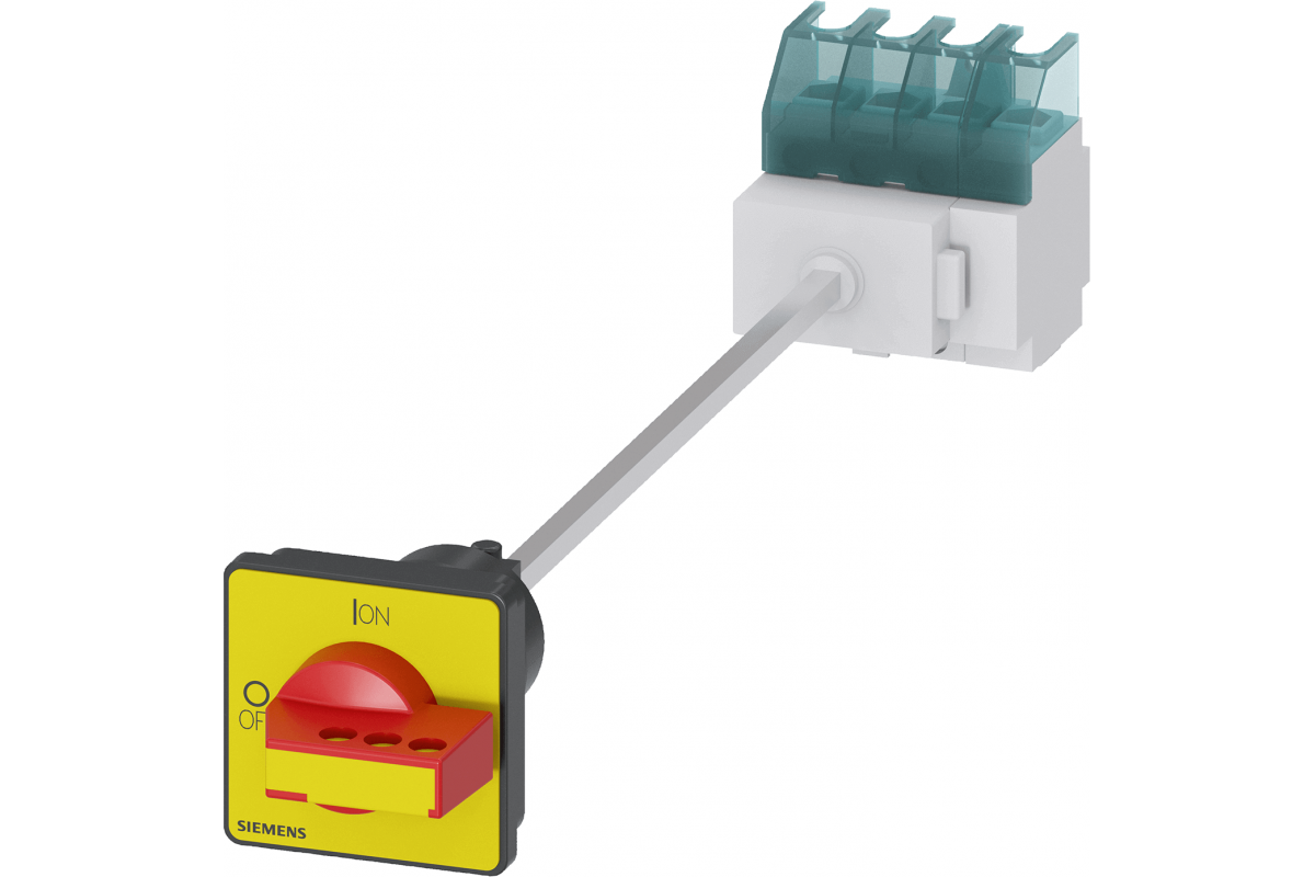 SENTRON, выключатель-разъединитель 3LD, выключатель аварийного отключения, 4-полюсный, Iu: 32 A, Рабочая мощность / при AC-23 A при 400 В: 11.5 кВт, напольный монтаж с дверной муфтой, механизм с отключающей ручкой, красный/желтый, монтаж рукоятки в 4 отверстия