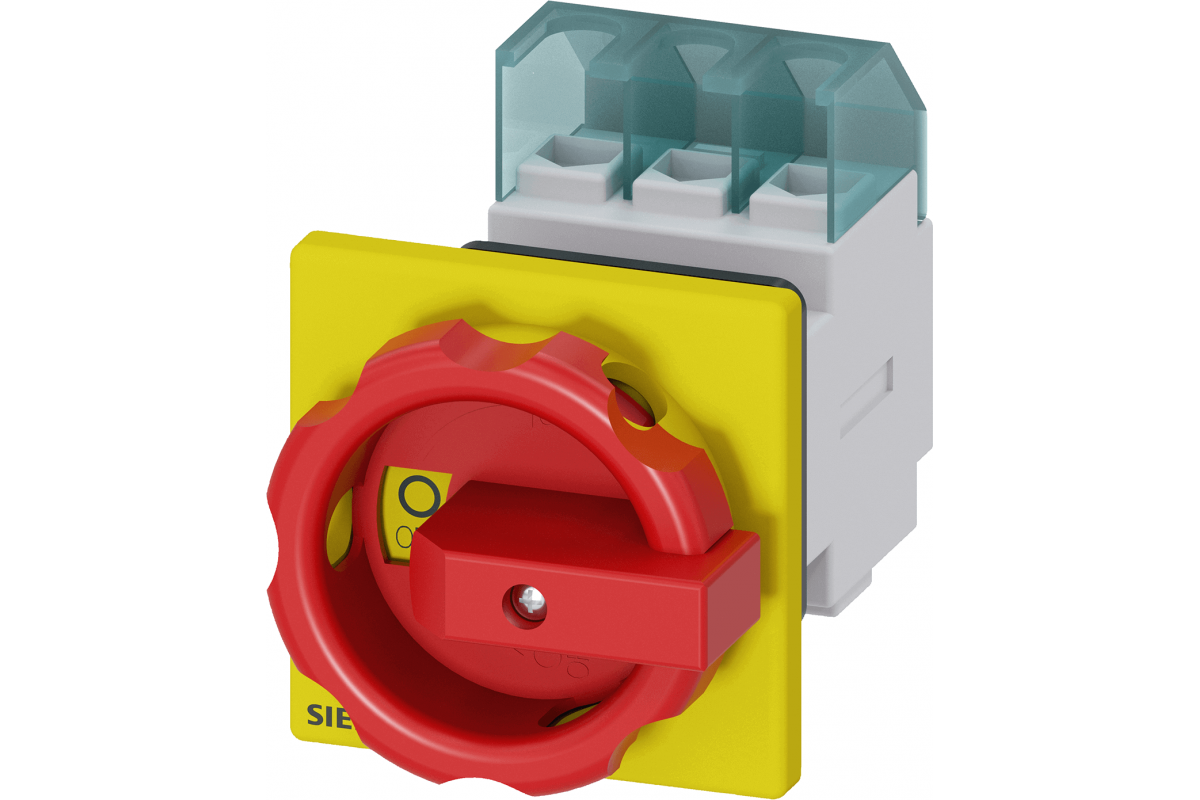 SENTRON, Выключатель-разъединитель 3LD, аварийный выключатель, 3-полюсный, Iu: 32 A, рабочая мощность / при AC-23 A 400 В: 11.5 кВт, фронтальный монтаж, поворотный механизм управления, красный / желтый, центральный монтаж 22.5 мм рукоятка