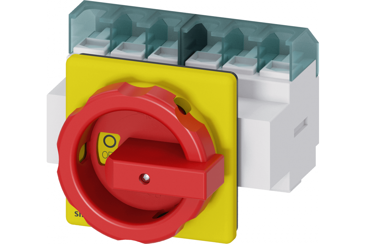 SENTRON, Выключатель-разъединитель 3LD, аварийный выключатель, 6-полюсный, Iu: 63 A, рабочая мощность / при AC-23 A 400 В: 22 кВт, фронтальный монтаж, поворотный рабочий механизм, красный / желтый, крепление рукоятки на 4 отверстия