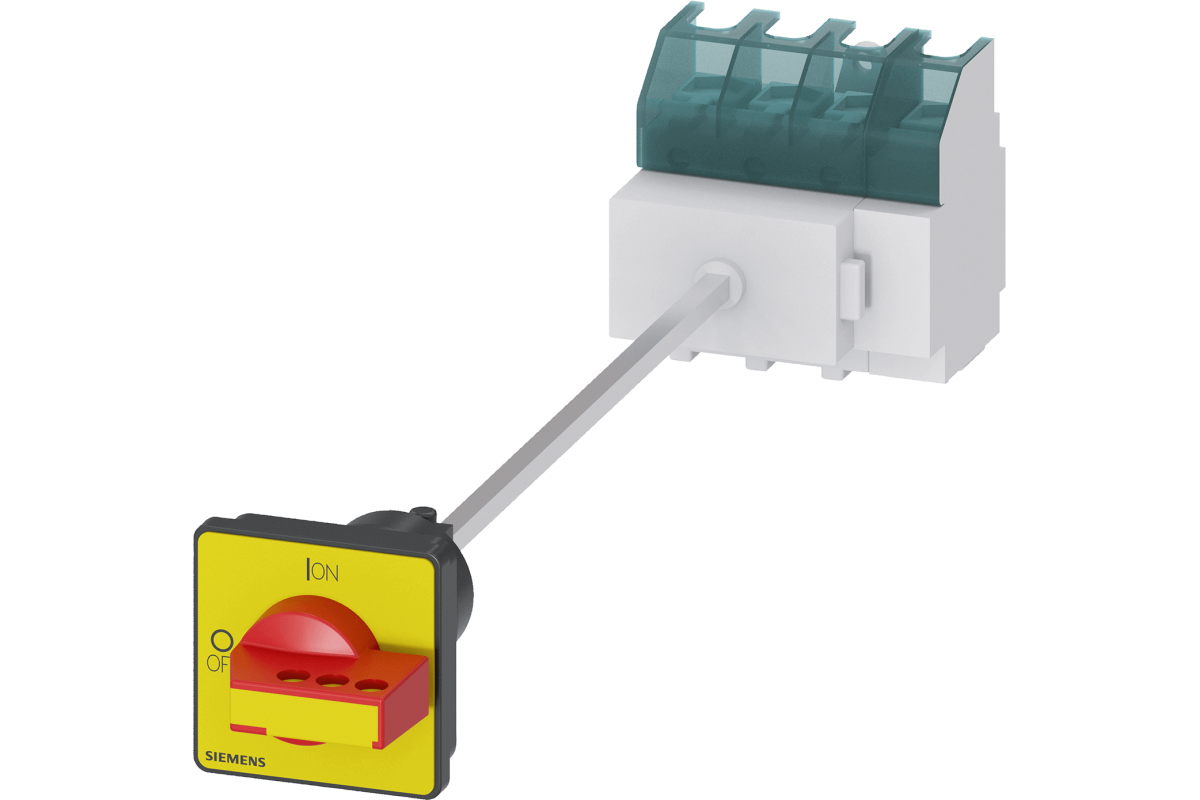 SENTRON, выключатель-разъединитель 3LD, выключатель аварийного отключения, 4-полюсный, Iu: 63 A, рабочая мощность / при AC-23 A при 400 В: 22 кВт, напольный монтаж с дверной муфтой, поворотный механизм, красный/желтый, крепление рукоятки на 4 отверстия