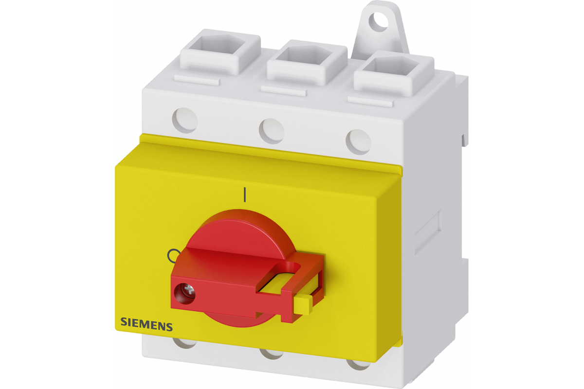 SENTRON, Выключатель-разъединитель 3LD, аварийный выключатель, 3-полюсный, Iu: 125 A, рабочая мощность / при AC-23 A 400 В: 45 кВт, установка в распределительных щитах, механизм с ручкой, красный / желтый, ручка непосредственно у выключателя