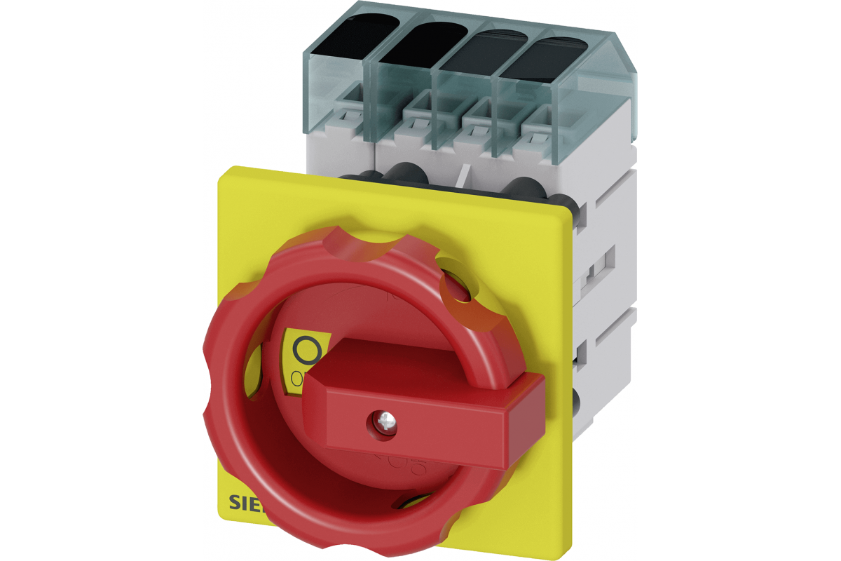 Выключатель нагрузки 3LD3, Iu 40 A Главный выключатель 3-полюсный + N Номинальная рабочая мощность при AC-23 A при 400 В 18.5 кВт Монтаж на передней панели Основной выключатель с монтажом в центральное отверстие 22.5 мм Тумблерный привод красный / желтый 66x66 мм