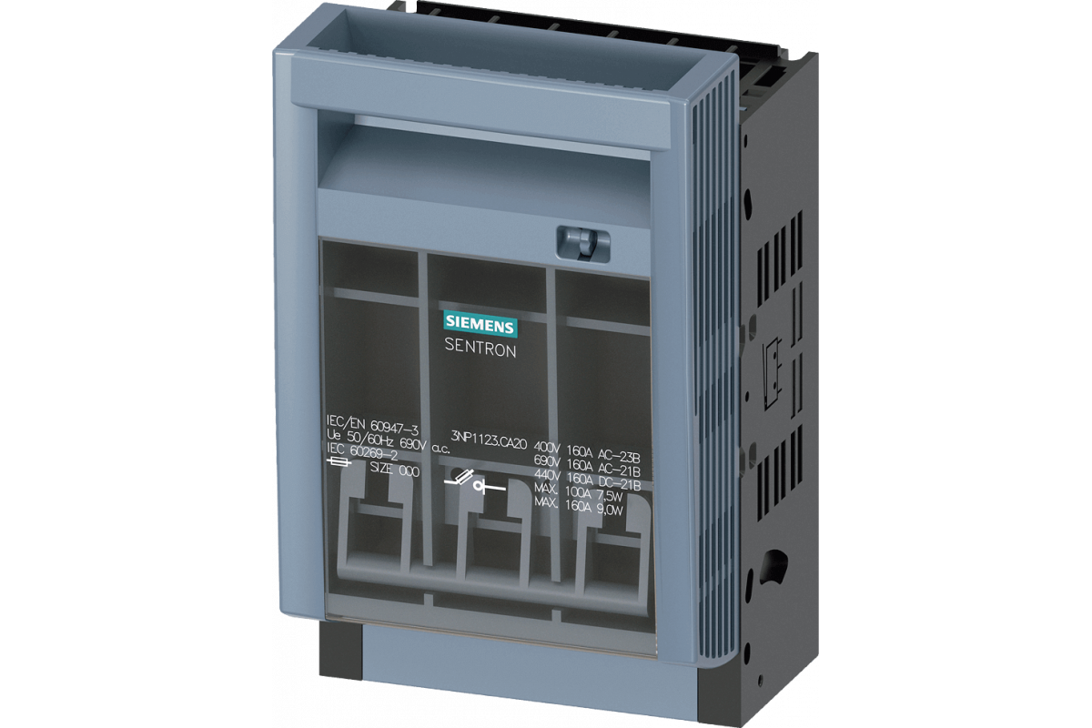 SENTRON, Разъединитель с предохранителями 3NP1, 3-полюсный, NH000, 160 A, для сборки и установки на монтажную плату, клеммную коробку, уровень крышки 45 мм