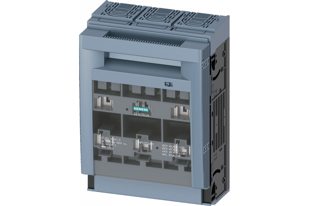 SENTRON, Разъединитель с предохранителем 3NP1, 3-полюсный, NH2, 400 A, для сборки и установки на монтажной панели, Коробчатая клемма, Уровень крышки 70 мм