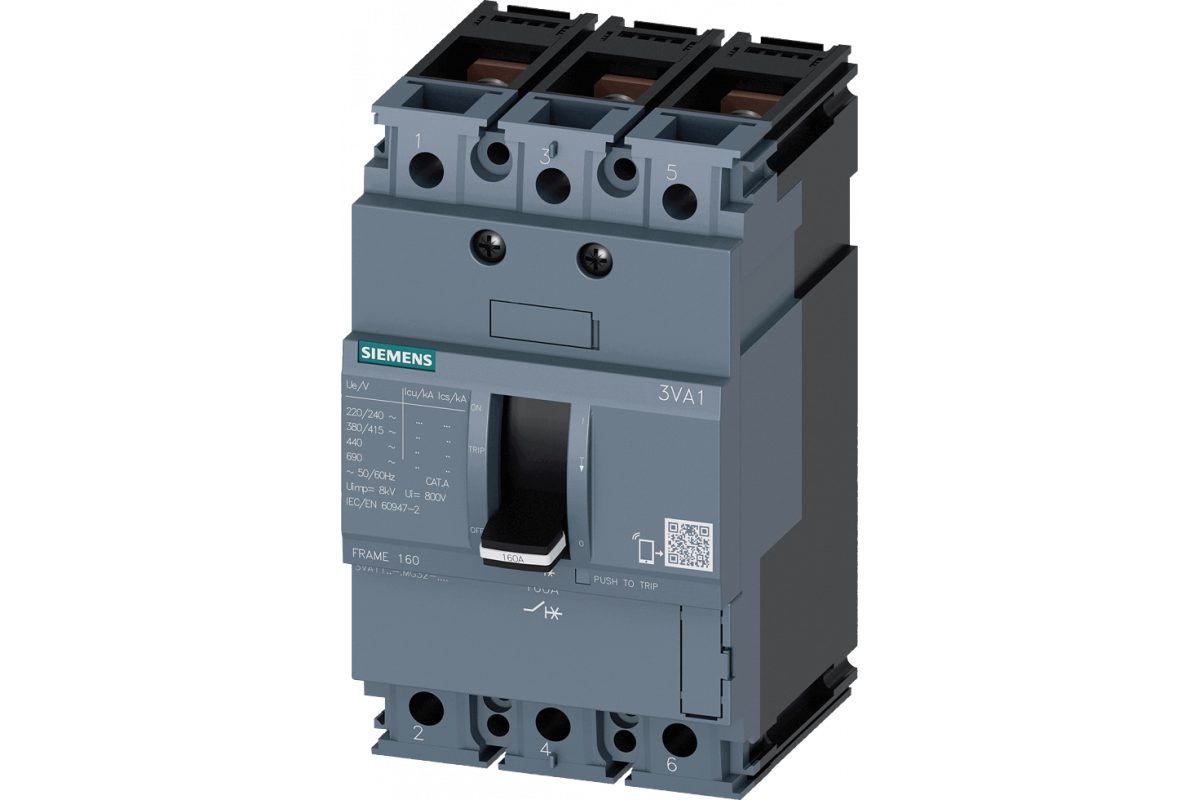 Автоматический выключатель 3VA1 IEC рамка 160 класс отключающей способности M Icu=55kA @ 415V 3-полюсный, защита пускателя TM110M, FM, In=2A без защиты от перегрузки защита от короткого замыкания Ii=15 x In комплект держателя гайки