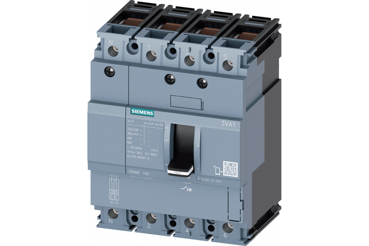 автоматический выключатель 3VA1 IEC frame 160 класс отключающей способности N Icu=25kA @ 415В 4 полюса, защита линии TM210, FTFM, In=100A защита от перегрузки Ir=100A фиксированная защита от короткого замыкания Ii=10 x In N защита проводника 100% зажимное соединение