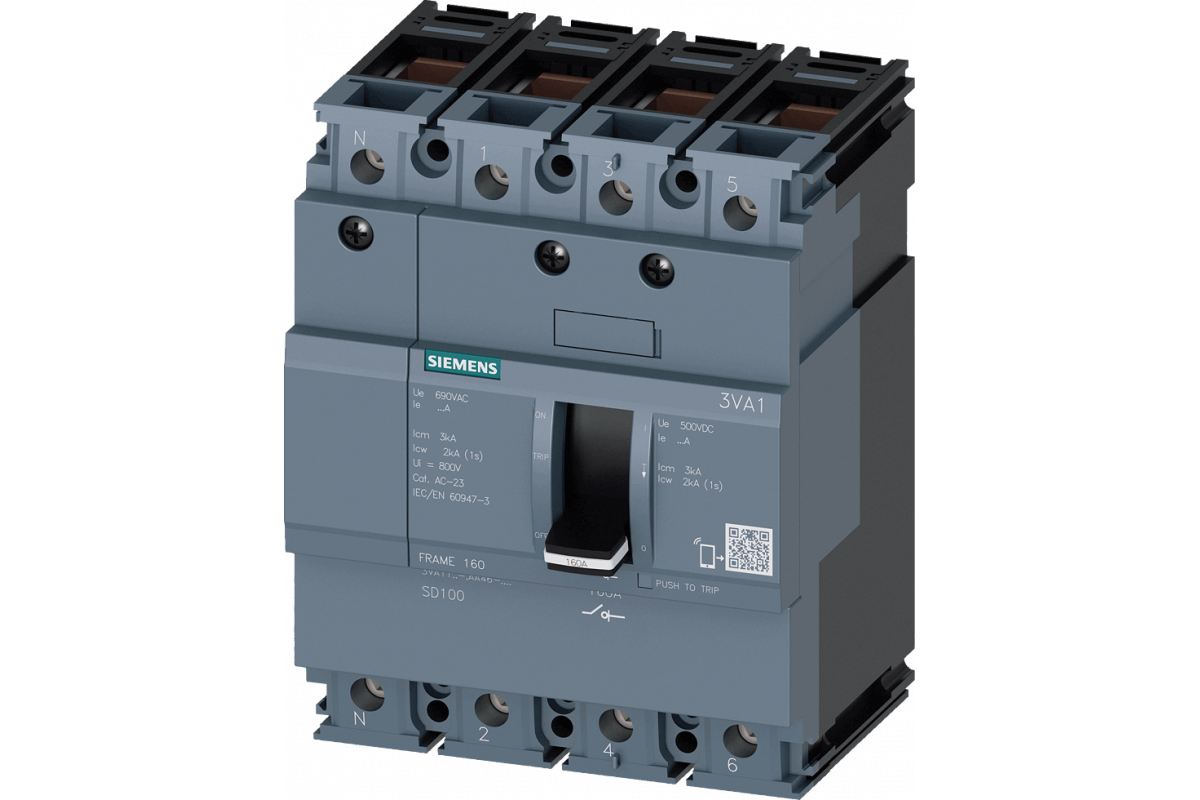 РАЗЪЕДИНИТЕЛЬ НАГРУЗКИ 3VA1 IEC ТИПОРАЗМЕР 160 4-ПОЛЮС. SD100, IN=125A БЕЗ ЗАЩИТЫ ОТ ПЕРЕГРУЗКИ БЕЗ ЗАЩИТЫ ОТ ТОКА КЗ ПРИСОЕДИНЕНИЕ КАБЕЛЕМ