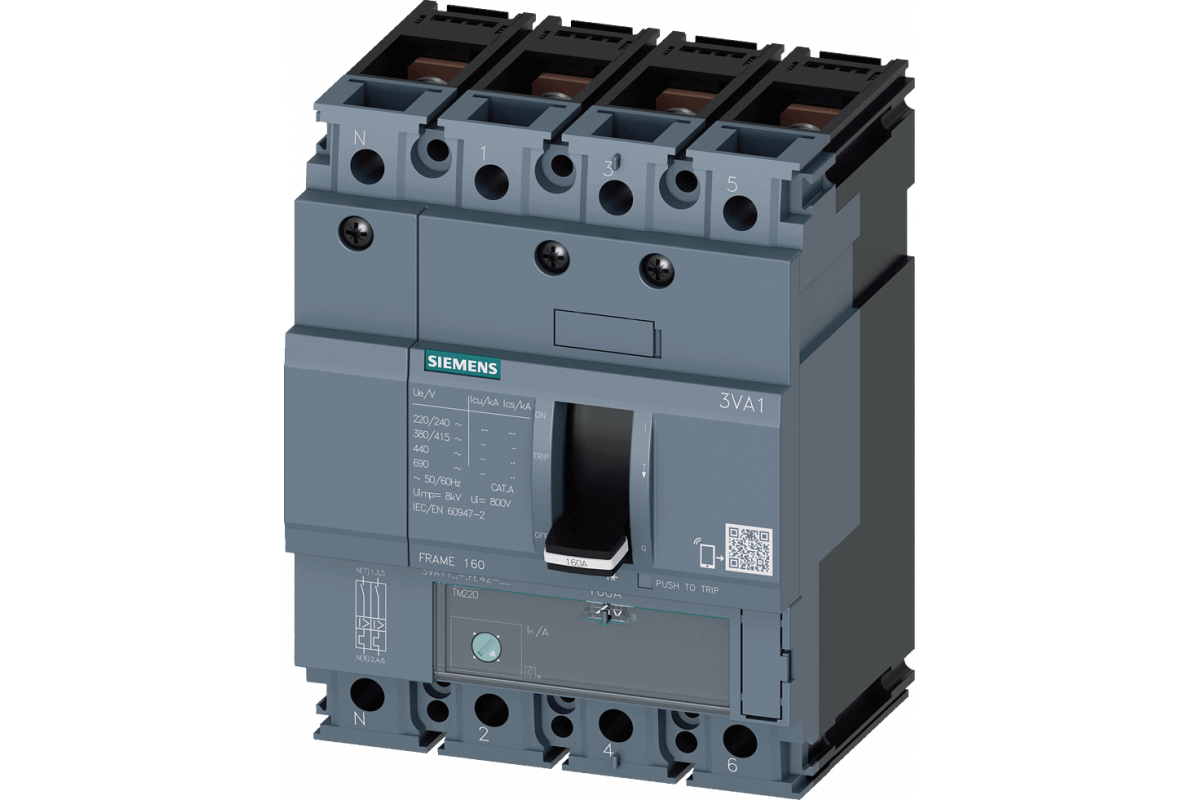 ВЫКЛЮЧАТЕЛЬ В ЛИТОМ КОРПУСЕ 3VA1 IEC ТИПОРАЗМЕР 160 КЛАСС ОТКЛ. СПОСОБНОСТИ S ICU=36KA @ 415 В 4-ПОЛЮС., ЗАЩИТА ЛИНИИ TM220, ATFM, IN=50A ЗАЩИТА ОТ ПЕРЕГРУЗКИ IR=35A ...50A ЗАЩИТА ОТ ТОКА КЗ II=10 X IN ЗАЩИТА НЕЙТРАЛИ 100% ШИННОЕ ПРИСОЕДИНЕНИЕ