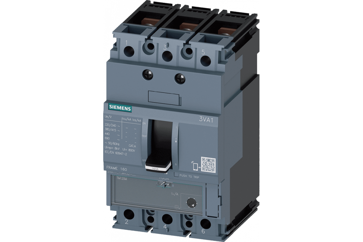 ВЫКЛЮЧАТЕЛЬ В ЛИТОМ КОРПУСЕ 3VA1 IEC ТИПОРАЗМЕР 160 КЛАСС ОТКЛ. СПОСОБНОСТИ H ICU=70KA @ 415 В 3-ПОЛЮС.,ЗАЩИТА ДВИГАТЕЛЯ TM120M, AM, IN=80A БЕЗ ЗАЩИТЫ ОТ ПЕРЕГРУЗКИ ЗАЩИТА ОТ ТОКА КЗ II=5...15 X IN ШИННОЕ ПРИСОЕДИНЕНИЕ
