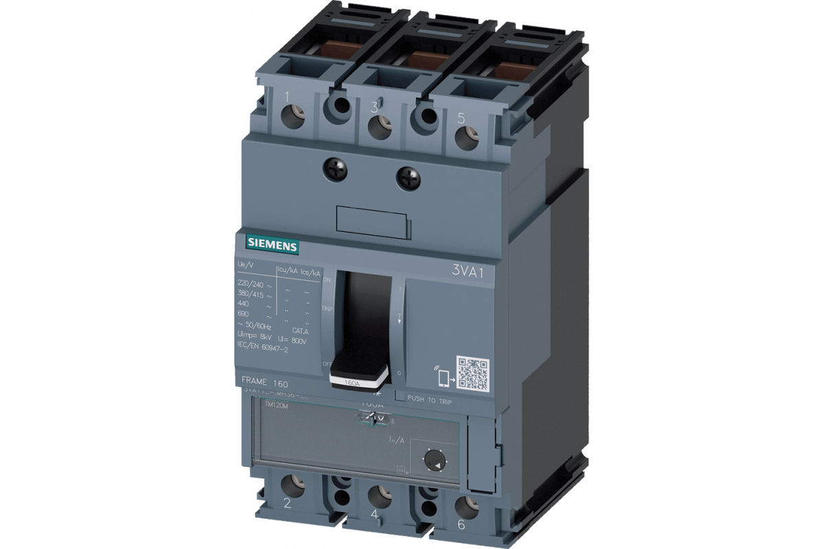 ВЫКЛЮЧАТЕЛЬ В ЛИТОМ КОРПУСЕ 3VA1 IEC ТИПОРАЗМЕР 160 КЛАСС ОТКЛ. СПОСОБНОСТИ H ICU=70KA @ 415 В 3-ПОЛЮС.,ЗАЩИТА ДВИГАТЕЛЯ TM120M, AM, IN=80A БЕЗ ЗАЩИТЫ ОТ ПЕРЕГРУЗКИ ЗАЩИТА ОТ ТОКА КЗ II=5...15 X IN ПРИСОЕДИНЕНИЕ КАБЕЛЕМ