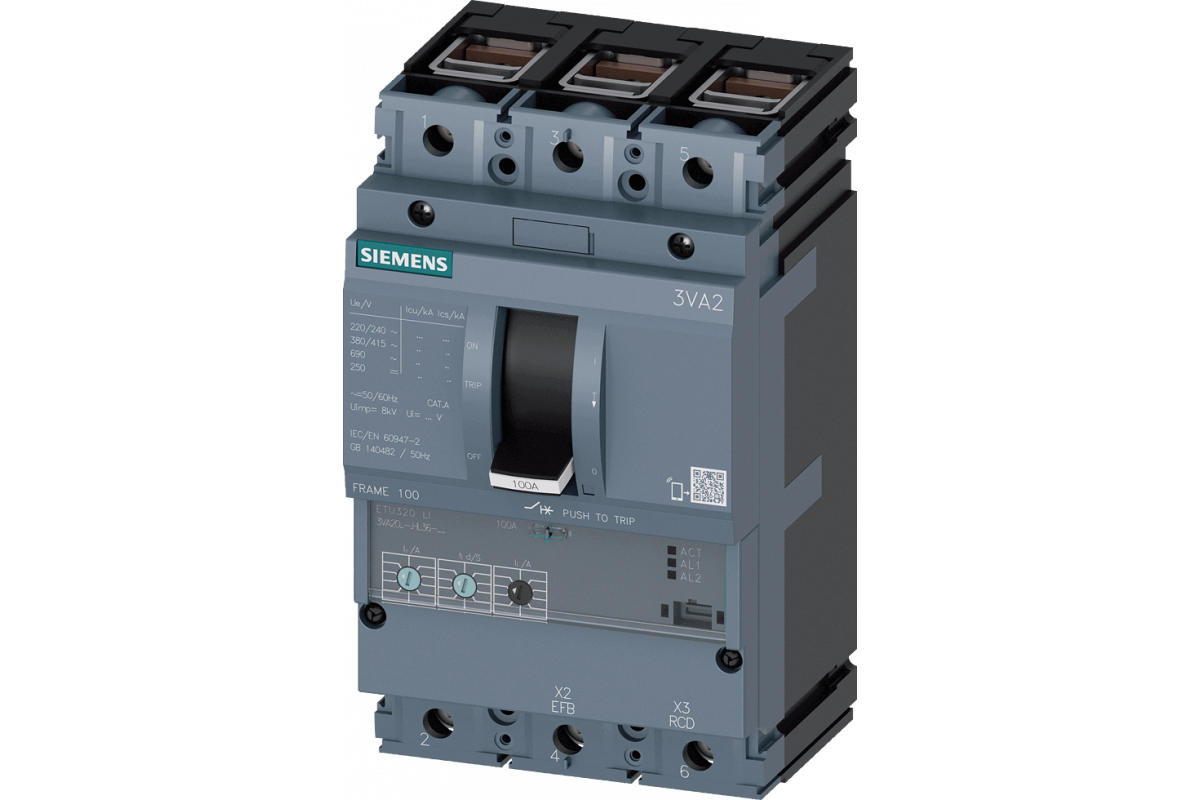 автоматический выключатель 3VA2 IEC frame 100 отключающая способность класс M Icu=55kA @ 415V 3-полюсный, защита линии ETU320, LI, In=100A защита от перегрузки Ir=40A...100A защита от короткого замыкания Ii=1.5...12 x Зажимное соединение