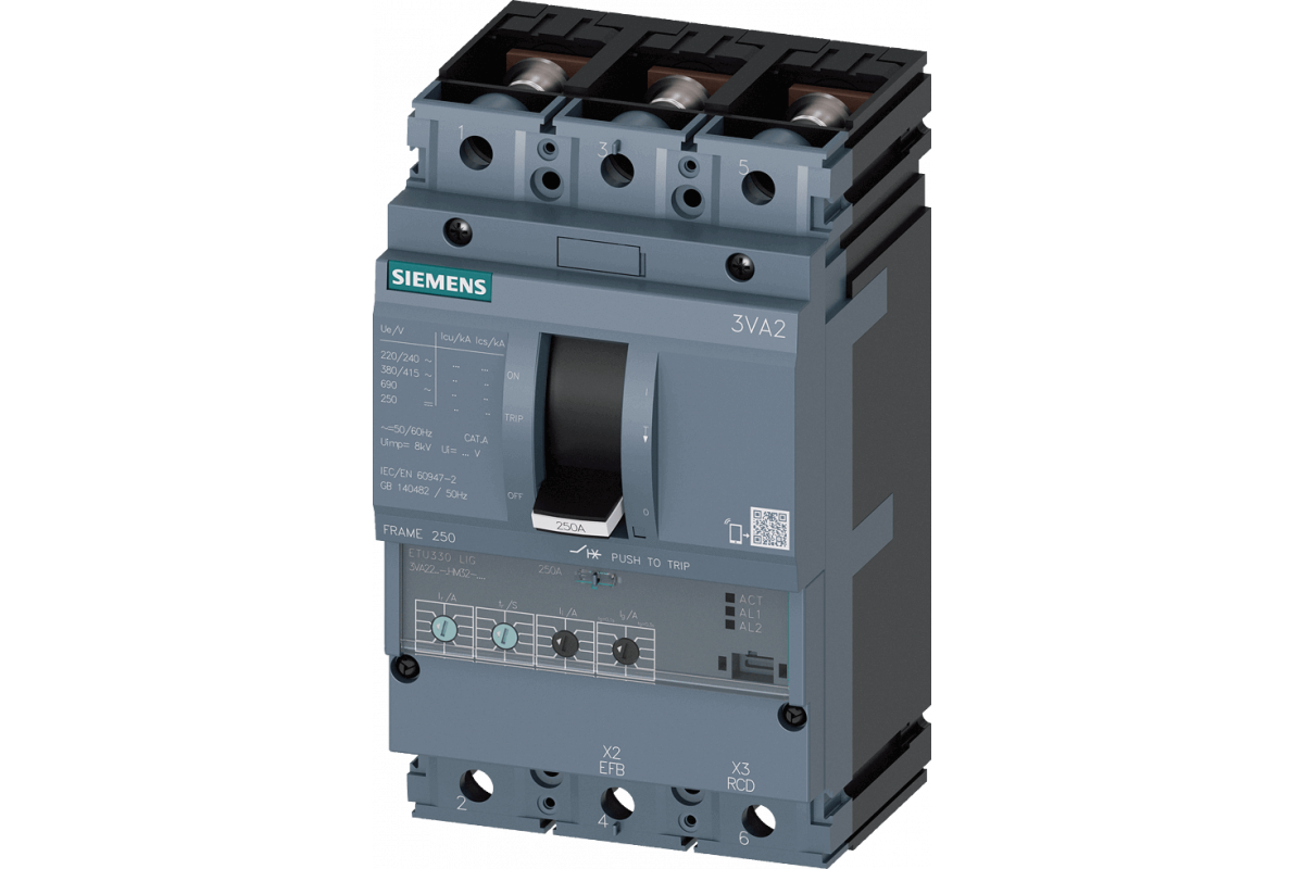 ВЫКЛЮЧАТЕЛЬ В ЛИТОМ КОРПУСЕ 3VA2 IEC ТИПОРАЗМЕР 250 КЛАСС ОТКЛ. СПОСОБНОСТИ M ICU=55KA @ 415 В 3-ПОЛЮС., ЗАЩИТА ЛИНИИ ETU330, LIG, IN=160A ЗАЩИТА ОТ ПЕРЕГРУЗКИ IR=64A ...160A ЗАЩИТА ОТ ТОКА КЗ II=1,5...12 X IN ЗАЩИТА ОТ ЗАМЫКАНИЯ НА ЗЕМЛЮ IG=0,2... 1 X IN, TG=0,1/0,3MS ШИННОЕ ПРИСОЕДИНЕНИЕ