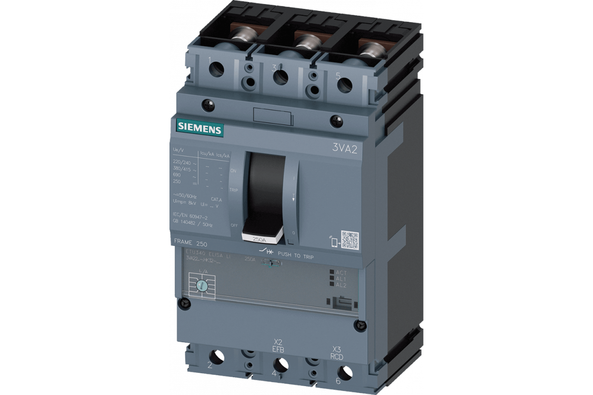 ВЫКЛЮЧАТЕЛЬ В ЛИТОМ КОРПУСЕ 3VA2 IEC ТИПОРАЗМЕР 250 КЛАСС ОТКЛ. СПОСОБНОСТИ H ICU=85KA @ 415 В 3-ПОЛЮС., ЗАЩИТА ЛИНИИ ETU340, ELISA LI, IN=160A ЗАЩИТА ОТ ПЕРЕГРУЗКИ IR=64A ... 160A ЗАЩИТА ОТ ТОКА КЗ II=15 X IN ШИННОЕ ПРИСОЕДИНЕНИЕ