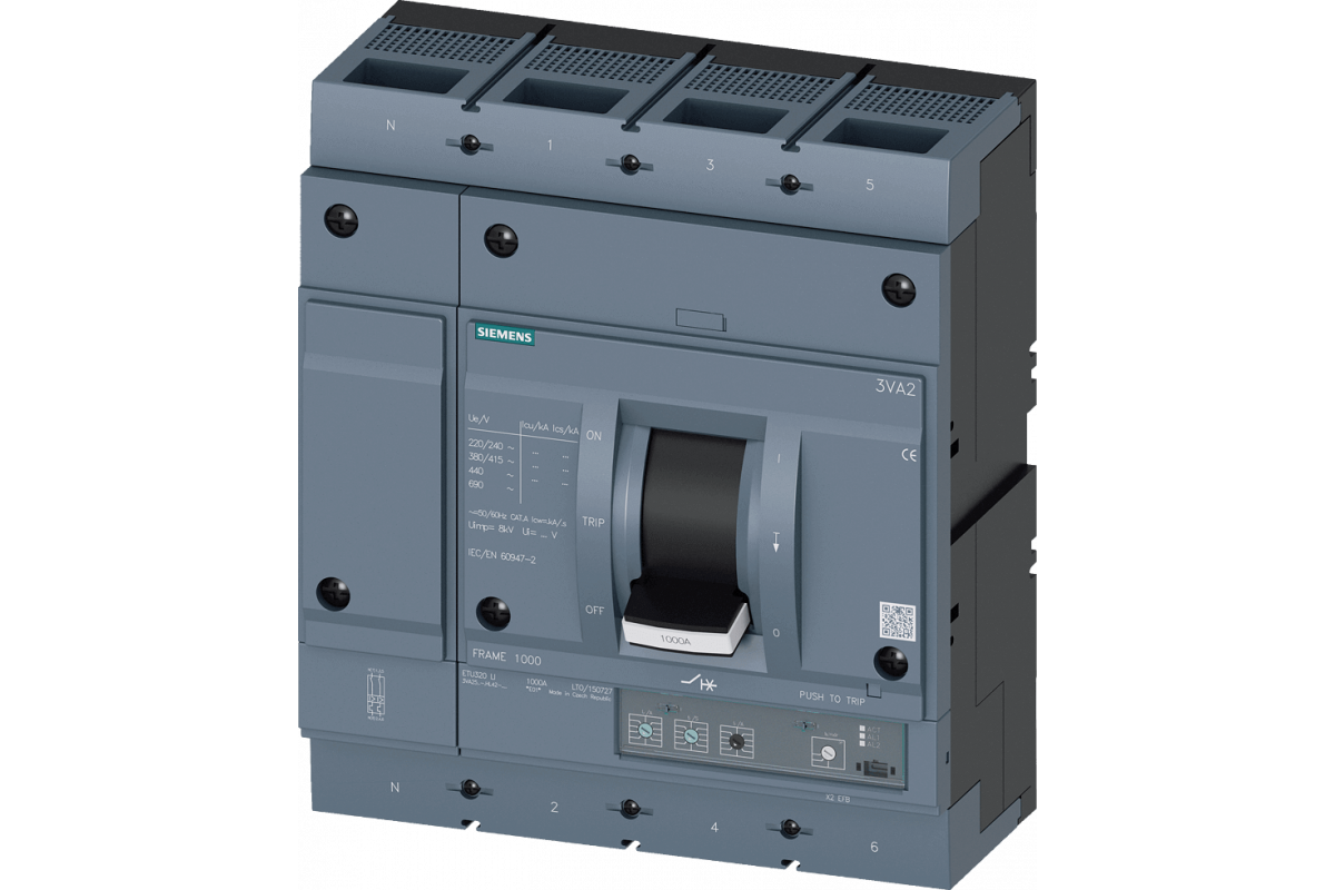 Автоматический выключатель 3VA2 IEC Frame 1000 Switching capacity class C Icu=110 kA @ 415 V 4-pole, system protection ETU320, LI, In=1000 A Overload protection Ir=400 A. ..1000 A short-circuit protection Ii=1.5...10 x In N-conductor protection adjustable (OFF, 50%, 100%) Lug terminal