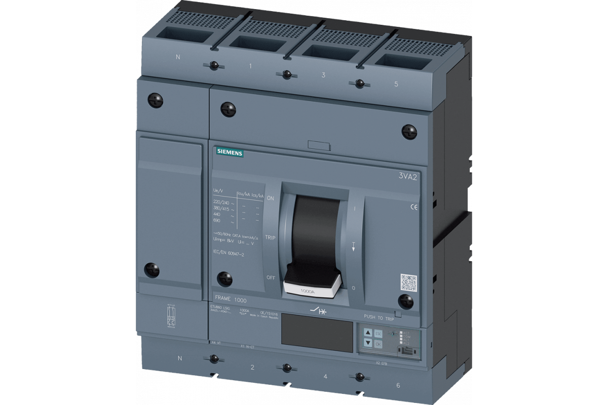 автоматический выключатель 3VA2 IEC рамка 1000 отключающая способность класс H Icu=85kA @ 415V 4-полюсный, защита линии ETU860, LSIG, In=800A защита от перегрузки Ir=320A...800A защита от короткого замыкания Isd=0.6..10x В, Ii=1.5..12x Защита проводников In N регулируемая (ВЫКЛ, до 160%) гр.-защита от повреждений., может быть переключен. выключено Ig=0.2...1 x In= tg=0.05-0.8s набор для фиксации гаек