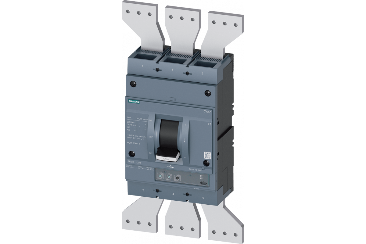 авт. выключатель 3VA2 IEC типоразмер 1250 класс коммутационной способности M Icu = 55 кA @ 415 В 3-пол., защита оборудования ETU320, LI, In = 1250 A защита от перегрузки Ir = 500...1250 А защита от коротких замыканий Ii = 1,5...10 x In плоский винтовой зажим