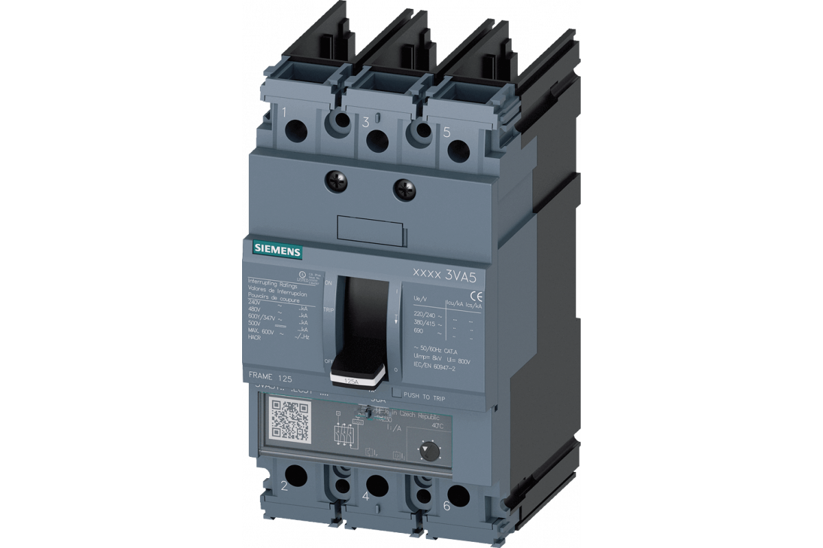 Автоматический выключатель 3VA5 UL frame 125 breaking capacity class S 25kA @ 480y/277V 3-pole, line protection TM230, ftaM, In=125A overload protection ir=125A fixed short circuit protection iI=5...10 x In w/o connection