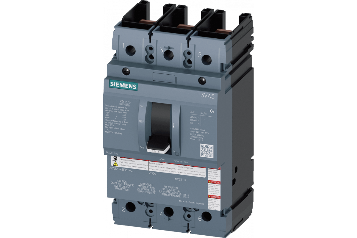 авт. выключатель в литом корпусе 3VA5 UL типоразм. 250 макс. отключающая способность при КЗ 100 кA @ 480 В 3-пол., защита оборудования MCS110, In = 100 А без защиты от перегрузки самозащита Ii = 16 x In без выводов