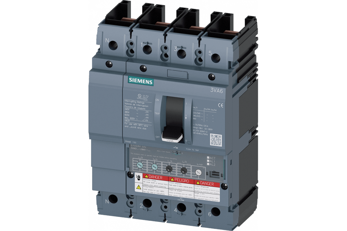 Автоматический выключатель 3VA6 UL Frame 150 Отключающая способность класс M 35кА @ 480В 4-полюсный, защита линии ETU330, LIG, In=100A Защита от перегрузки, 100% номинальная Ir=40A...100A Защита от короткого замыкания Ii=1.5...12 x In N защита проводников регулируемая (ВЫКЛ, 50%, 100%) защита от замыкания на землю Ig=0.2...1 x In= tg=0.1/0.3 с без подключения