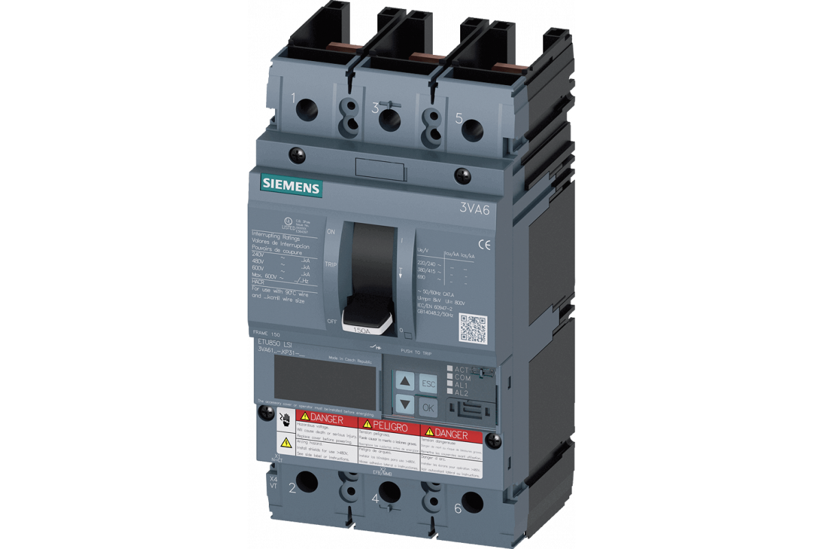 Автоматический выключатель 3VA6 UL Frame 150 отключающая способность класс H 65kA @ 480V 3-полюсный, защита линии ETU850, LSI, In=100A защита от перегрузки, 100% номинальная Ir=40A...100A Защита от короткого замыкания Isd=0.6..10x In, Ii=1.5..12x In N защита проводников опционально с внешним ТТ, до 160% без подключения